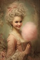 Een humoristisch kunstwerk waarin een elegante barokke edelvrouw een zachte roze suikerspin vasthoudt, geschilderd in de verfijnde stijl van de oude meesters en met een speelse moderne twist die vrolijkheid uitstraalt. De combinatie van delicate kantdetails, warme lichtval en een verrassend hedendaags element creëert een charmant tafereel dat meteen een glimlach oproept.