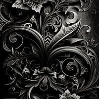 Een verfijnde zwart-wit gravure met een ingewikkeld bloemenpatroon geïnspireerd op klassieke barokkunst. De symmetrische compositie benadrukt de wervelende bladeren en ornamentele details met krachtige, vloeiende lijnen die diepte en verfijning toevoegen. Tegen een donkere achtergrond benadrukt het elegante gebruik van negatieve ruimte de delicate texturen, waardoor een tijdloos, contrastrijk kunstwerk ontstaat. Ideaal voor decoratieve prints, luxe branding of voor iedereen die houdt van historische elegantie en ingewikkeld vakmanschap.