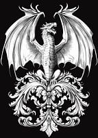 Een imposante draak spreidt zijn vleugels uit over kunstig gebogen, barokke ornamenten. De monochrome illustratie geeft de afbeelding een dramatische en mystieke sfeer, die doet denken aan middeleeuwse fantasieën en een krachtige, legendarische aanwezigheid uitbeeldt.