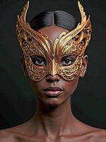 Het barokke duivelsschilderij is een fascinerend, hyperrealistisch portret van een vrouw met een weelderig gouden masker. De titel geeft perfect de ambivalente uitstraling van het ontwerp weer: het combineert de weelderige esthetiek van de barok met een vleugje demonisch. Het masker is een meesterwerk van vakmanschap. De gehele gouden buitenkant is versierd met filigraan, barokke decoraties bestaande uit organische rondingen en symmetrische patronen. Tegelijkertijd geven de prominente, naar boven gerichte uitsteeksels boven de ogen aan dat het gestileerde hoorns zijn, wat het kunstwerk een mysterieuze en licht dreigende dimensie geeft. In het midden van de afbeelding staat de kalme maar doordringende blik van de vrouw. Haar ogen vormen een fascinerend contrast met de gemaskerde weelde. Ze zijn het venster naar een innerlijk dat wordt weerspiegeld door zowel de schoonheid van het masker als de donkere, mysterieuze symboliek ervan. Het schilderij speelt met de contrasten van licht en schaduw, esthetiek en ondeugendheid, en creëert zo een portret van onverflauwde elegantie en diep mysterie.