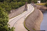 Mooie S-vormige dijk met een beeld van een Leeuw van een groot stuwmeer in de Belgische Ardennen in de buurt van Jalhay.