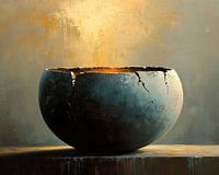 Gebarsten Kom - Dit stilleven schilderij toont een gebarsten keramieken kom tegen een goud getinte achtergrond, waarbij de lichtreflectie en textuur de focus leggen op de imperfecties en schoonheid van het object.