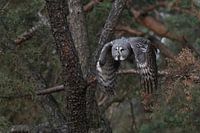 Bartkauz / Great Grey Owl ( Strix nebulosa ) takes off for hunting, in flight, flying, frontal side shot, beating its wings, in fall, Europe.