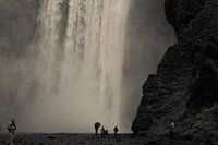 Het onderste deel van de Skogafoss, IJsland, in zwart-wit. Je ziet hoe klein de mensen zijn die voor de waterval staan, deze is 25 meter breed en 60 meter hoog.