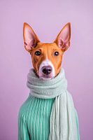 Een elegante Basenji presenteert zichzelf in stijlvol mintgroen, gewikkeld in een knusse sjaal. Zijn grote, alerte oren en fijne hoofd in zachte aardetinten stralen intelligentie en nieuwsgierigheid uit. Met zijn charmante uiterlijk lijkt hij zowel speels als verfijnd - een echt uniek karakter in de hondenwereld.