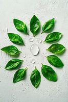 Vers groen ontvouwt zich in een harmonieus arrangement, terwijl sprankelende waterdruppels het geheel levendig maken. De zachte, lichtgevende bladeren vormen een organisch kunstwerk dat ideaal is voor in de keuken. Het inspireert tot culinaire avonturen en geeft een gevoel van natuurlijkheid en vitaliteit. Een echte blikvanger voor alle fijnproevers!
