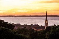 Gezicht op de torenspits van de Basiliek Notre-Dame en de baai van Arcachon bij zonsondergang, Arcachon, Aquitaine, Nieuw-Aquitaine, Frankrijk.