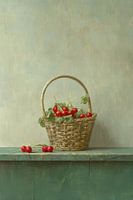 Basket of Summer Reds - Dit stilleven schilderij toont een geweven mand gevuld met helderrode kersen, rustend op een gedempt groene ondergrond, uitgelicht tegen een zacht getextureerde, lichte achtergrond.
