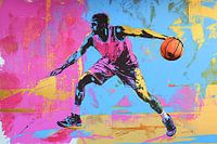 Basketbal Speler - Op dit basketbal schilderij zie je een atletische man in een roze sportoutfit die energiek een basketbal vasthoudt en door de lucht beweegt, met een achtergrond in felle kleuren zoals blauw en roze die een dynamische sfeer creëren.