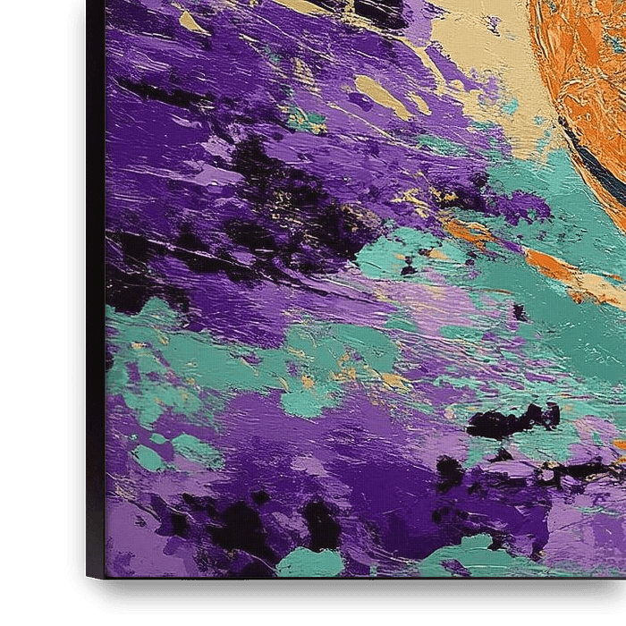 Basketbal - Dit is een basketbal schilderij met een opvallende oranje bal die zich in een dynamische beweging bevindt, omringd door een kleurrijke achtergrond van paars en turquoise.