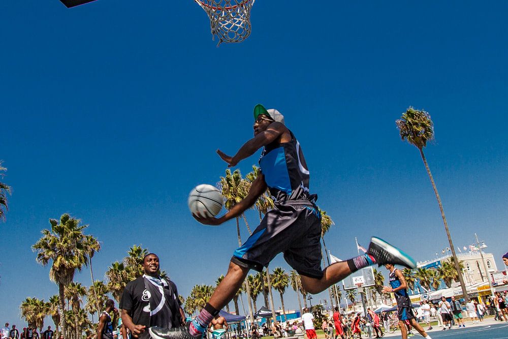Speel mee met de Venice Beach Basketball League of bekijk een wedstrijd. Foto is genomen tijdens de voorbereiding op een match.