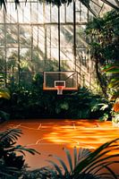 Stel je een levendig toevluchtsoord voor waar groen en sport op spectaculaire wijze samensmelten. Een basketbalveld omringd door weelderige planten en zachte lichtstralen creëert een uitnodigende sfeer. Ideaal voor een creatieve woonkamer waar een actieve levensstijl en natuurlijke schoonheid harmonieus samenkomen. Een plek die zowel rust als inspiratie biedt!