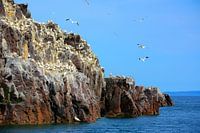 Auf dem Bass Rock im Firth of Forth befindet sich eine riesige Brutkolonie von Basstölplen. North Berwick, East Lothian, Schottland. Sommer 2013.