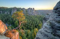 Eine sehr bekannte Kiefer klammert sich in schwindelerregender Höhe an einen Felsen bei der Felsenburg Neurathen im Elbsandsteingebirge. Im Hintergrund sind die Felsen der "Kleinen Gans" zu sehen, links im Wehlgrund ein Teil der Felsenbühne Rathen.