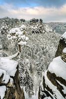 Die Basteikiefer (auch Pölking-Kiefer genannt) mit der sehr markanten Form wächst auf einem Felsen bei der Felsenburg Neurathen. Die Aufnahme entstand nach tagelangen Schneefällen.