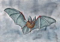 Deze aquarel toont een vliegende vleermuis. Als krachtdier helpt de vleermuis ons om ons te heroriënteren en open te staan voor verandering, om onze waarneming te verscherpen en onze intuïtieve kracht te gebruiken, zodat hij ons helpt om angst te overwinnen.