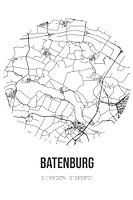 Zwart-witte landkaart, stratenplan of plattegrond van Batenburg. Batenburg is gelegen in regio Rivierenland, in de gemeente Wijchen, provincie Gelderland. Op de stadskaart zijn alle openbare wegen in Batenburg opgenomen. Verder is de kaart voorzien van de coördinaten van het centrum van Batenburg.