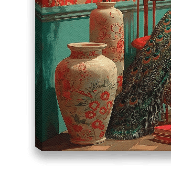 Een kleurrijke badkamer met een opvallend vintage rode badkuip op pootjes met een sierlijke pauw op de rand, die zijn felgroene en blauwe verenkleed laat zien. De muren zijn versierd met felrode en turquoise verf, aangevuld met decoratieve vazen ​​met oranje bloemen. Een geblokte vloer leidt naar een sierlijke deuropening op de…
