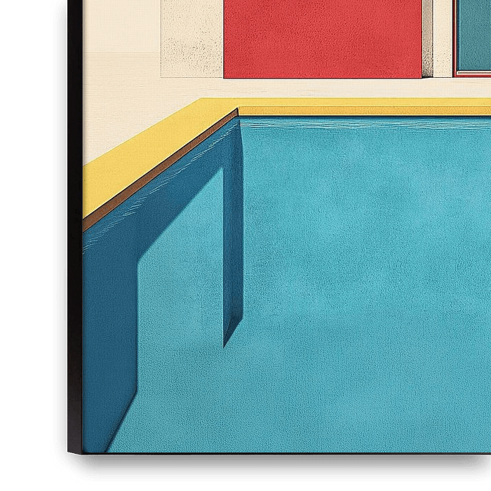 Koop dit abstracte kunstwerk Bauhaus Architectuurzwembad Beige Blauw van Niklas Maximilian op canvas, aluminium dibond, (ingelijste) fotoprint, behang en ArtFrame, op maat geprint in Fine-Art kwaliteit.