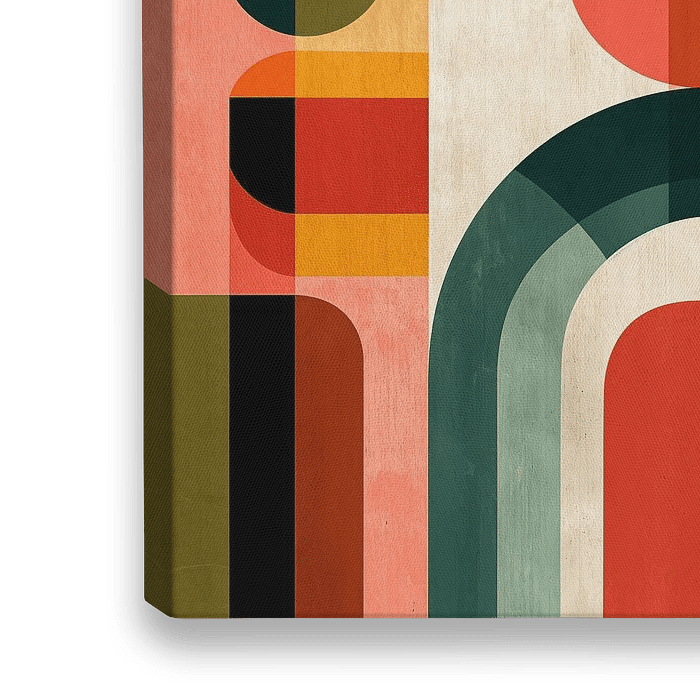 Een compositie van geometrische vormen in een warm, retro kleurenpalet. Het kunstwerk combineert bogen, cirkels en rechthoeken in tinten van terracotta, mosterdgeel, bosgroen en zachtroze. De overlappende elementen creëren een dynamisch spel van diepte en transparantie, wat doet denken aan de Mid-Century Modern kunststroming, Bauhaus.