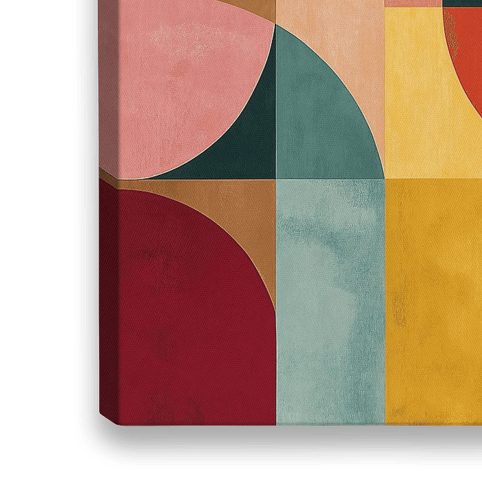 Een stijlvol abstract kunstwerk dat de essentie van mid-century modern design vangt in een harmonieus samenspel van warme en koele kleuren. Geometrische vormen, voornamelijk cirkels en rechthoeken, overlappen elkaar in een uitgekiend kleurenpalet van terracotta, mosterdgeel, roze en turquoise, wat resulteert in een dynamische maar…