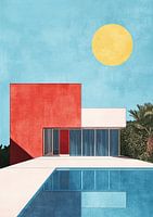 Bauahaus-minimalistische illustratie van een modern architectonisch huis met een zwembad tegen een felblauwe lucht en zon op de achtergrond. Het kleurenpalet bestaat uit rood, wit en pasteltinten.