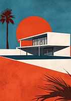 Een mid-century moderne Bauhaus poster met een geheel wit, minimalistisch huis in Japanse stijl met een blauwe lucht en een oranje zon erboven. De grond bestaat uit zandduinen. Aan één kant is een palmboom te zien. Minimalistische illustratie.