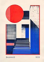 Een poster voor de tentoonstelling in Bauhaus-stijl, met eenvoudige geometrische vormen en een blauw, rood en wit kleurenschema, gedrukt op papier. De titel "Bauhaus" verschijnt in grote letters in het midden bovenaan, omringd door architecturale illustraties. Rechtsonder verschijnt een trap die naar een open deur leidt, wat diepte…