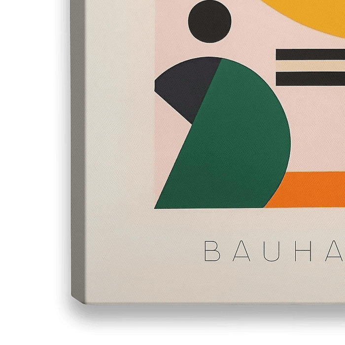 Een poster met het woord "Bauhaus" in grote letters, met gedurfde geometrische vormen en vlakke kleuren in blauw, groen, roze, geel en wit, met een minimalistisch ontwerp dat de stijl van de Bauhaus-beweging belichaamt.