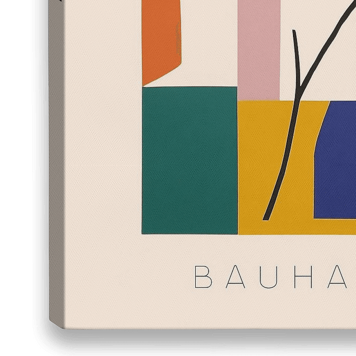 Een poster in Bauhaus-stijl met platte geometrische vormen en lijnen, met een kleurrijk ontwerp en de tekst "BAUHAUS" in wit op een beige achtergrond en een abstract bladmotief.