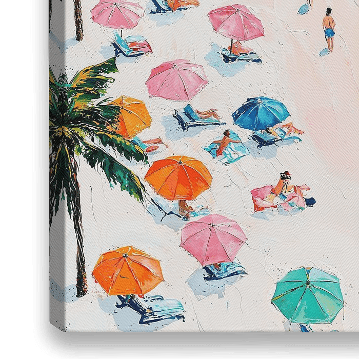 In dit kunstwerk wordt de een zomerse stranddag tot leven gebracht in een mix van pastel kleuren en tinten, die prachtig samensmelten en de zomerse sfeer oproepen.