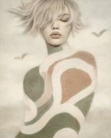 Dynamisch abstract portret van een vrouw met zachte neutrale tinten.