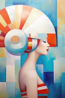 Vrolijk gekleurd profiel portret van een vrouw in een gestreept badpak met een grote surrealistische zeeschelp en badmuts op haar hoofd.