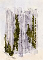 Digitale aquarel. Bij de creatie van dit werk ben ik geïnspireerd door paalhoofden op het strand, waar ik erg graag kom. De paalhoofden zijn gedeeltelijk bedekt met zeewier, een schitterend beeld. Waar ik meestal werk met lijn, hen ik nu alleen de aquarellen gebruikt. Het is geabstraheerd, maar heeft wel een zekere natuurlijke…