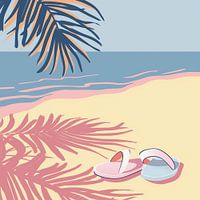 Zomerse afbeelding van een heerlijk dagje naar het strand. Vector image. Pasteltinten in geel, roze en blauw. Strand, zee, slippers en palmbomen. Zomer en zon. Passend bij diverse stijlen en trends. Artist: Bianca ter Riet.