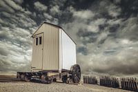 Een vintage strandcabine in Middelkerke . Het lage perspectief en de achterliggende wolkenhemel geven het geheel een dreigende look