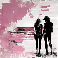 Een werk van mixed media, paletmes techniek en weelderige acrylverfstreken. 'Strand met haar' is een prachtige representatie van liefde en natuur. Een stel op het strand, dat uitkijkt naar de horizon in bewondering van de schoonheid om hen heen. Roze.
