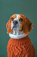 Een beagle met zachte, trouwe ogen en grote, expressieve oren zit stijlvol in een warme, rustieke trui. De heldere bruine en witte kleuren geven hem een charmante uitstraling, terwijl zijn oplettende blik harten verovert. Een echt charismatische metgezel die gezelligheid en vreugde uitstraalt.