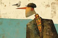 Beak Whispers - Dit mannen schilderij toont een gestileerde man met een grote, opvallende snavel en een zeevogel rustend op zijn snavel, beide gestileerd tegen een achtergrond met verweerde texturen.