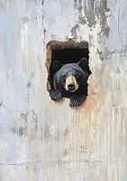 Bear Behind the Crumbling Wall - Dit dierenschilderij toont een indrukwekkende beer die nieuwsgierig uit een ruwe, verweerde opening in een verouderde muur gluurt, gevangen in een realistische stijl met nadruk op textuurdetails en de uitdrukking van de beer.