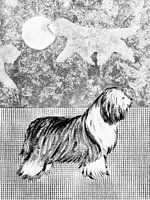 Deze monotype is gemaakt met een gelliplate. Een uniek en eenmalig werk, er kan maar 1 afdruk worden gemaakt van je ontwerp. Door de druktechniek en het gebruikte papier ontstaan er allerlei structuren en effecten. De hond in de voorgrond is later op de print geschilderd. De bearded collie is een hondenras, afkomstig uit Schotland.