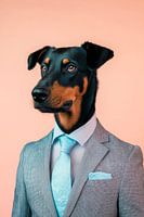 Met een charmante uitdrukking en een sierlijke, elegante verschijning straalt deze Beauceron zelfvertrouwen uit. Zijn glanzende, zwartbruine vacht contrasteert perfect met het stijlvolle pak, terwijl de aandachtige ogen getuigen van intelligentie en loyaliteit. Een echt uitzonderlijke metgezel die zowel kracht als gratie belichaamt.