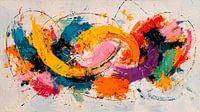 Een expressief abstract kunstwerk met levendige kleuren en gedurfde bewegingen die energie en dynamiek uitstralen. De dominante kleuren contrasteren sterk met de neutrale witte en beige achtergrond. Dikke, gebogen lijnen in verschillende kleuren zijn verweven met dikke vegen en texturen, aangebracht met een impastotechniek. Dit schilderij geeft een gevoel van spontane beweging en een gemoedstoestand van het moment weer - als een explosie van emoties of een innerlijke verkenning die visueel vorm krijgt. Het werk heeft een intern ritme dankzij de gebogen lijnen en sterke contrasten en kan worden gezien als een symbolische weergave van prachtige chaos of dynamische harmonie. Het is ideaal voor moderne ruimtes die creativiteit, levendigheid en een sterke persoonlijkheid willen uitstralen.