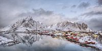 De foto toont het vissersdorp Reine in het noorden van Noorwegen. Reine wordt vaak - en terecht - beschreven als het mooiste vissersdorp op de Lofoten. De typische rode huizen passen harmonieus in het landschap en zorgen voor een zeer schilderachtig beeld! Deze foto is genomen tussen de vele sneeuwbuien door. De snelle overgang van donkere wolken naar blauwe lucht weerspiegelt de ruige charme van dit gebied, maar geeft de foto ook een aantrekkelijke, positieve uitstraling. De foto is professioneel gefotografeerd en is bijzonder geschikt voor afdrukken op groot formaat!
