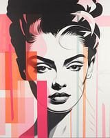 Portret van een mooie vrouw in zwart wit popart met roze, oranje, zalm en grijskleurige strepen en vlakken. Op art. Abstract en realistisch. Passend bij diverse stijlen en trends. Neon.