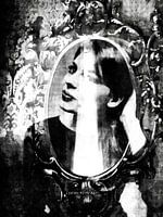 Een zwart/wit afbeelding in halftone van een mooie vrouw kijken in een spiegel. Ondanks dat de afbeelding zwart/wit is, heeft het toch een romantische uitstraling.
