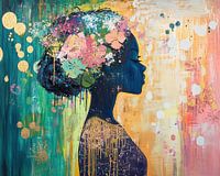 Beauty in Abstract Blooms - Dit vrouwen schilderij toont een zijprofiel van een vrouw met een kleurrijke, abstracte mix van bloemen en vlinders in haar haar, tegen een achtergrond vol levendige strepen en spetters in goud en pasteltinten.