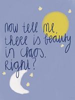 Dit schilderij voelt als een zachte knuffel. De tekst “now tell me, there is beauty in chaos, right?” staat losjes geschreven over een rustige, blauwpaarse achtergrond. Rechtsboven gloeit een warme gele zon, linksonder hangt een witte, dromerige maan. Die combinatie van dag en nacht, licht en donker, chaos en schoonheid maakt het werk…