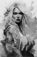 Een portret van een elegante, sensuele, sexy jonge vrouw, of meisje, afgebeeld in zwart wit. Zij heeft blond haar en indringende ogen waardoor zij een mysterieuze uitstraling heeft, een bijna boze blik in haar ogen. Het geheel is in een abstracte aquarel uitgevoerd. Het beeld is met behulp van ai gegenereerd.