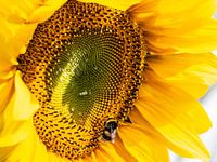 Hommel op bedauwde zonnebloem in de ochtendzon